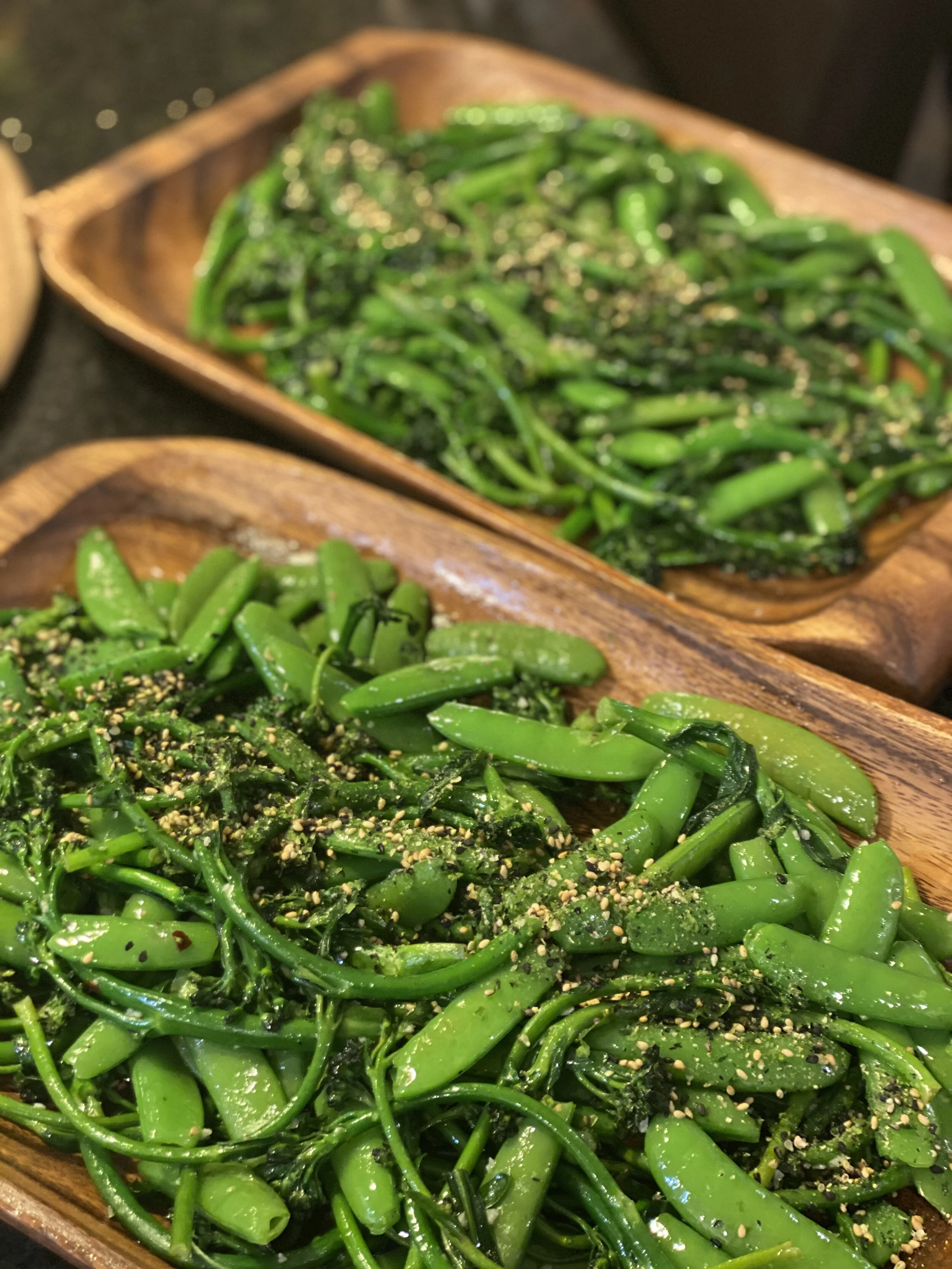 Place both veggies in a bowl and toss with your sesame oil, braggs, and furikake. top with additional furikake or sesame seeds.