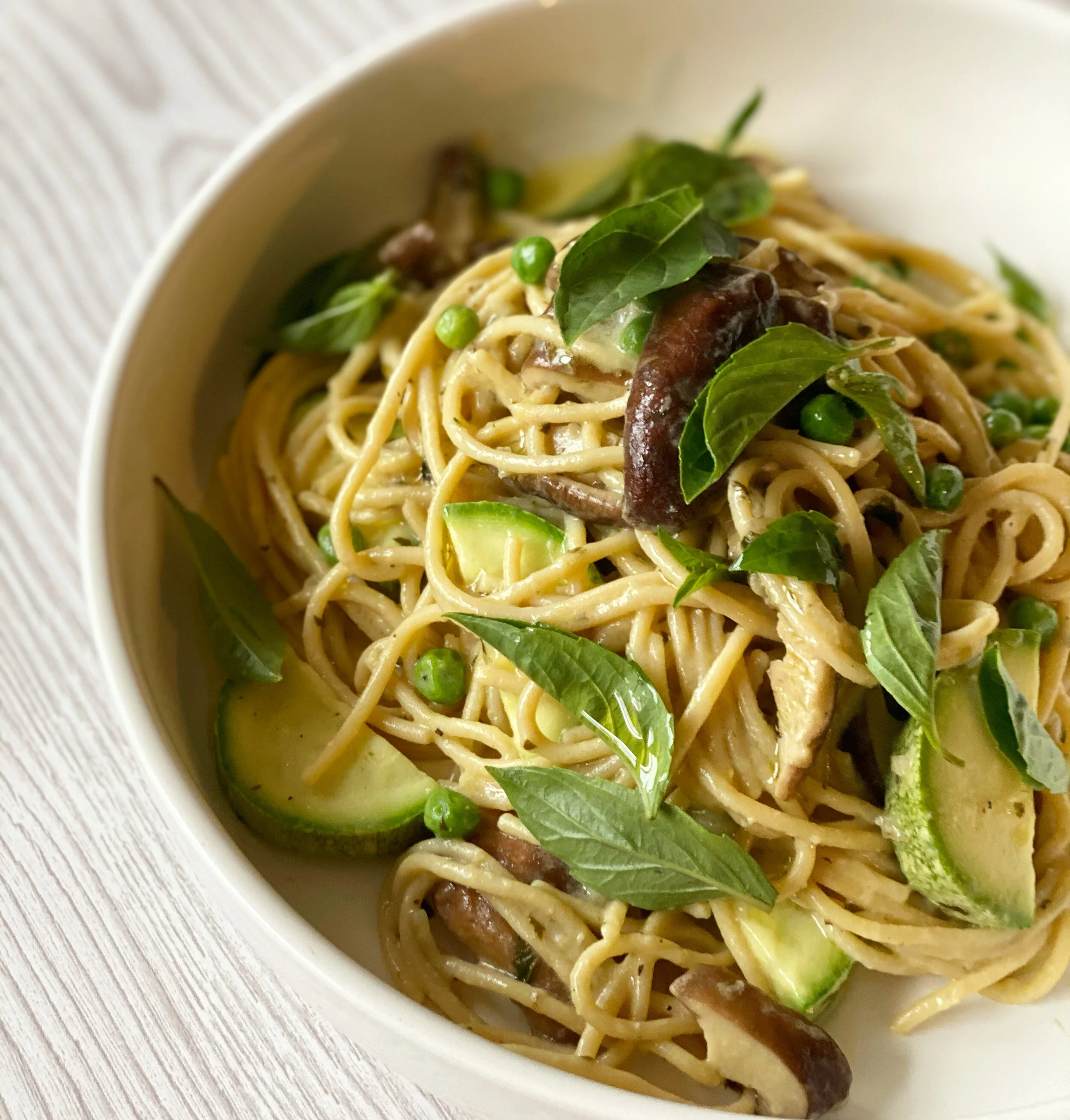 Southern California decided to be 58 degrees all day on the first day of June. So I decided to create something decadent and warm for dinner. My boyfriend and I had been craving pasta so I decided to surprise him with this yummy dish! I created a delicious creamy spring pesto spaghetti. I Love topping my dishes with the delicious basil from the farmers market. You wont believe this dish is vegan with how creamy it tastes! The Banzas chickpea spaghetti used in this recipe adds protein to the dish and makes it gluten free! Enjoy!