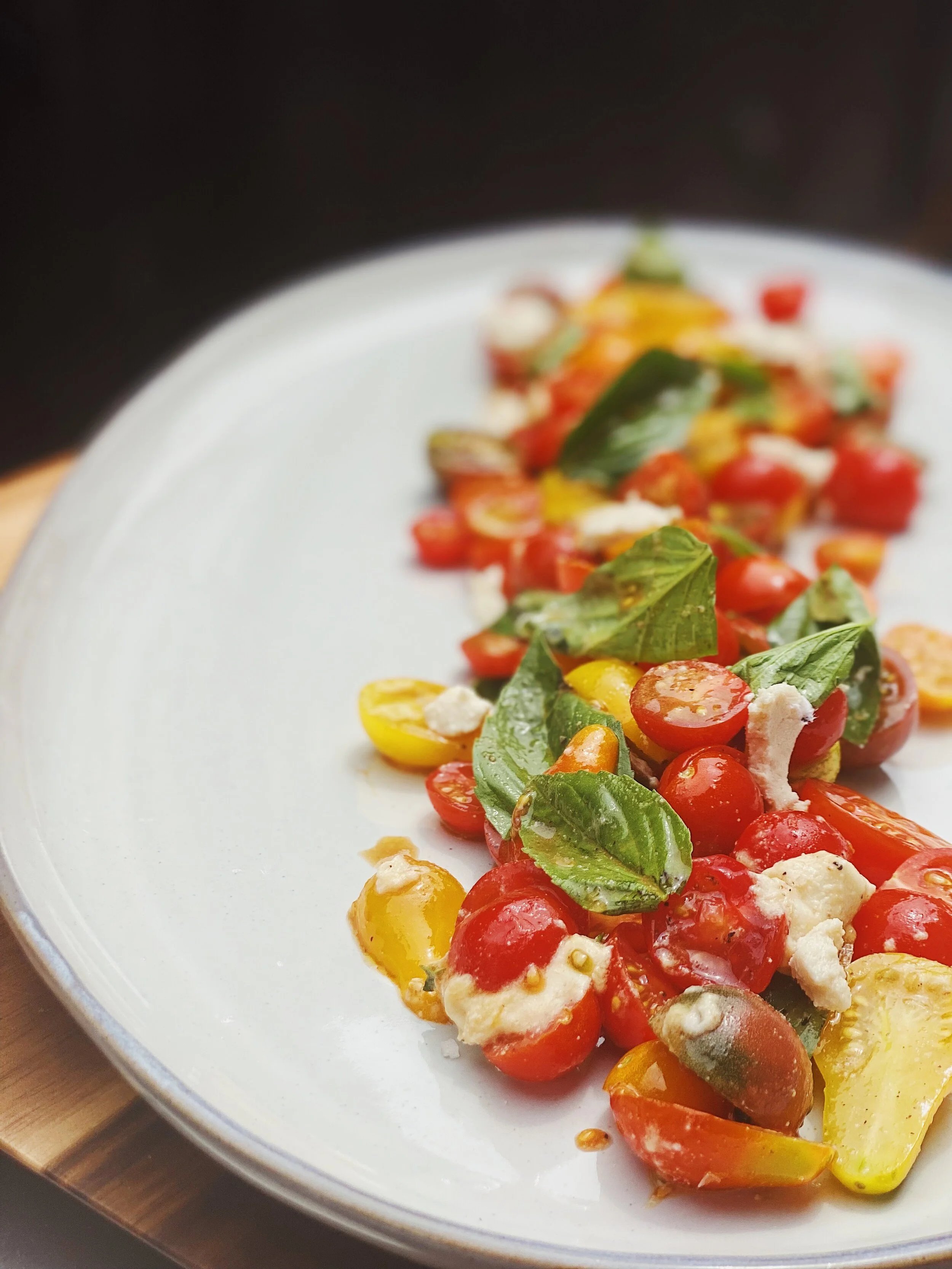 A simple, seasonal recipe inspired by a classic Caprese salad—using sun-ripened cherry tomatoes, garden-fresh basil, and vegan feta. It's a fresh, customizable summer dish perfect for showcasing peak-season produce and creative twists on tradition.