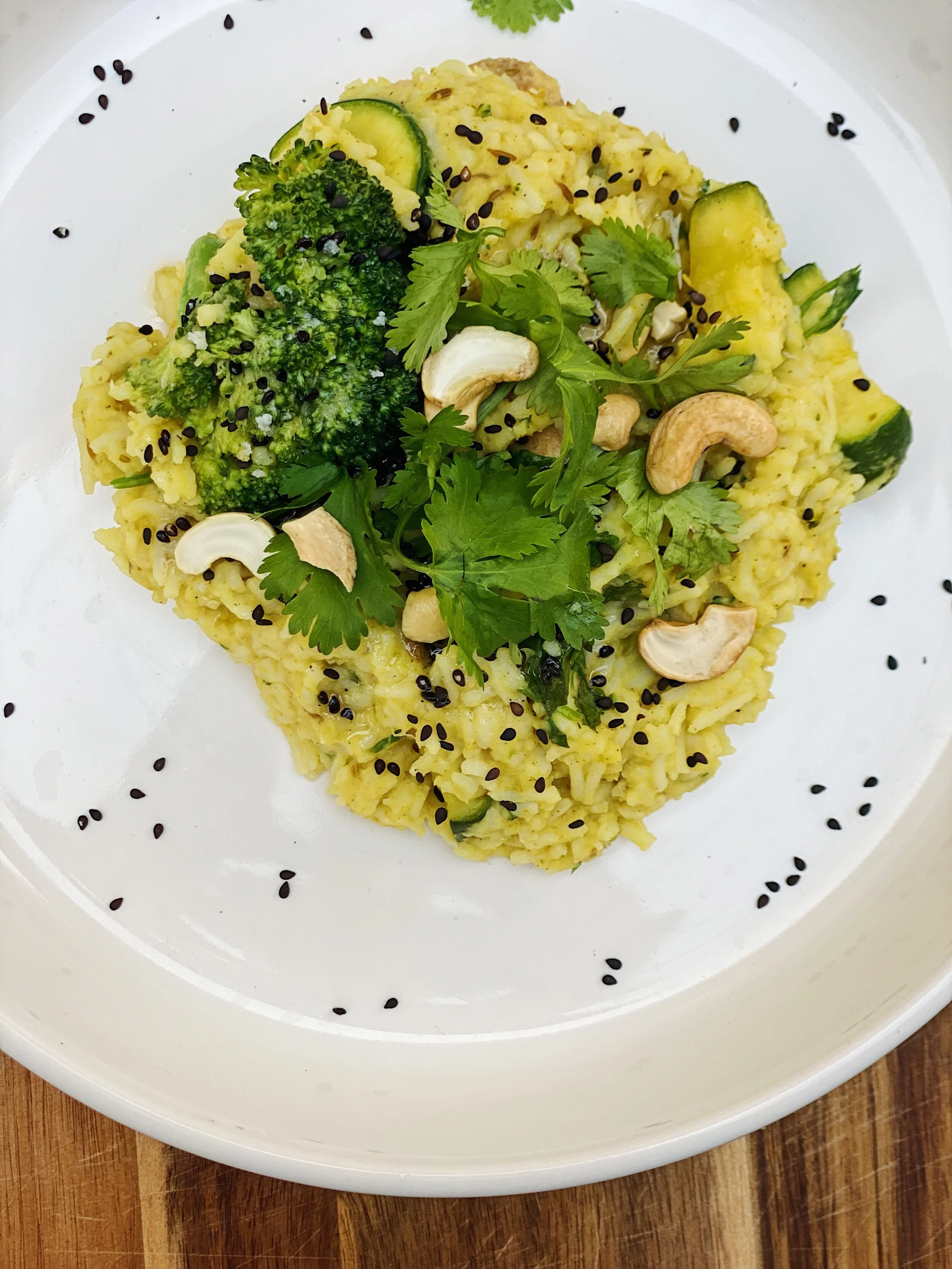 Kitchari is one of my all-time favorite comfort foods. This cozy, porridge-like dish is made with basmati rice and yellow moong dal, simmered with healing spices like turmeric, cumin, ginger, and black pepper. A staple in Ayurvedic cooking, it’s gentle on digestion and was my go-to during Panchakarma. I love packing it with veggies like zucchini, squash, broccoli, sweet potatoes, and spinach. For toppings, I reach for lime juice, cilantro, black sesame seeds, black lava salt, cashews, or a splash of Bragg’s Liquid Aminos. Nourishing, grounding, and endlessly customizable!
