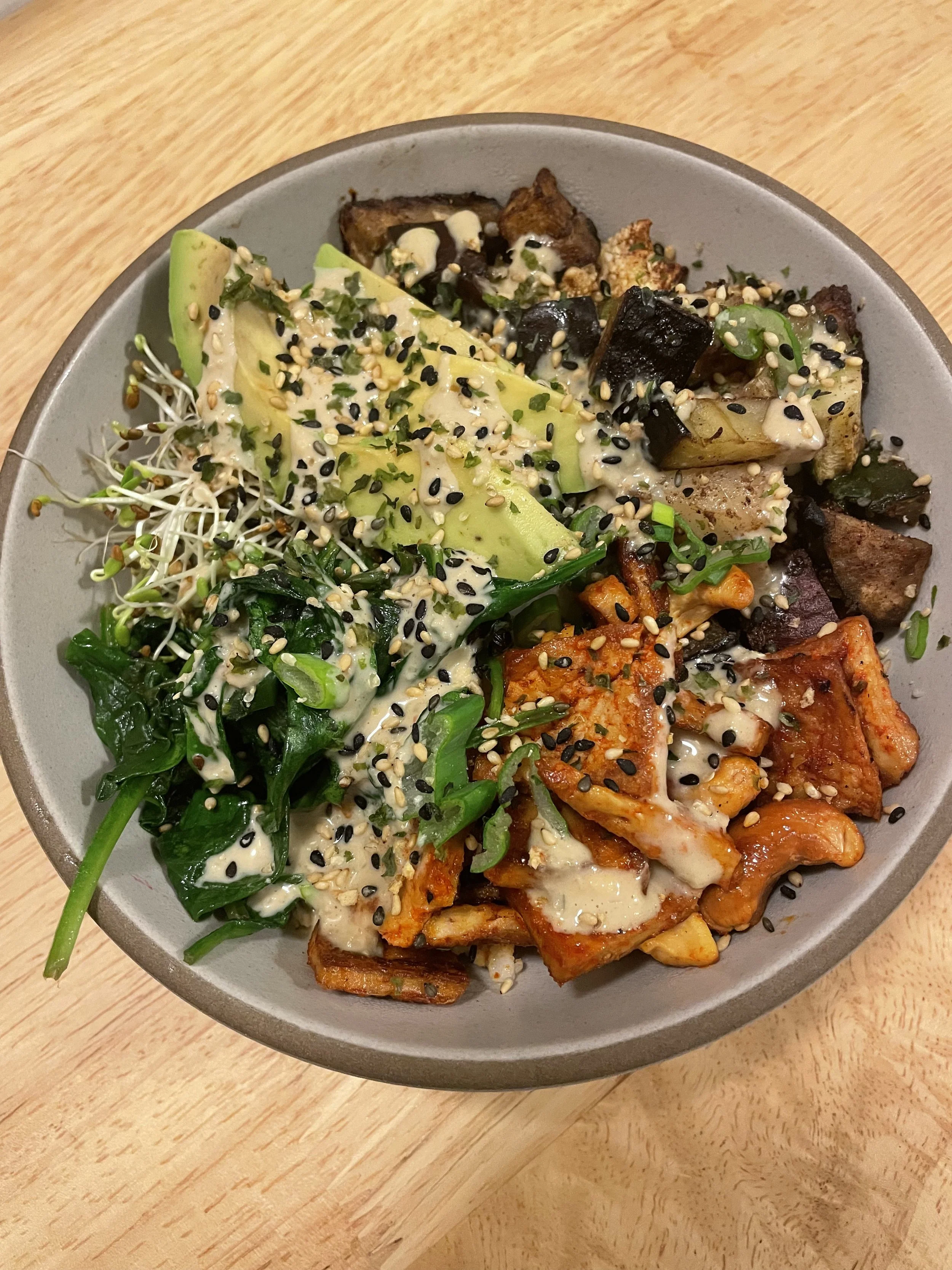Looking for a nourishing, flavor-packed meal to wow your friends (or just yourself)? This Asian-inspired Buddha Bowl is a total knockout! I served it at a girls' dinner night and OMG—every bite was better than the last. Featuring five-spice roasted veggies, basmati rice, tofu-cashew sauté, and a creamy miso tahini dressing, this bowl is endlessly customizable. I topped mine with sautéed spinach, avocado, sprouts, green onions, and furikake for the ultimate umami crunch. Bonus? It tastes even better the next day!